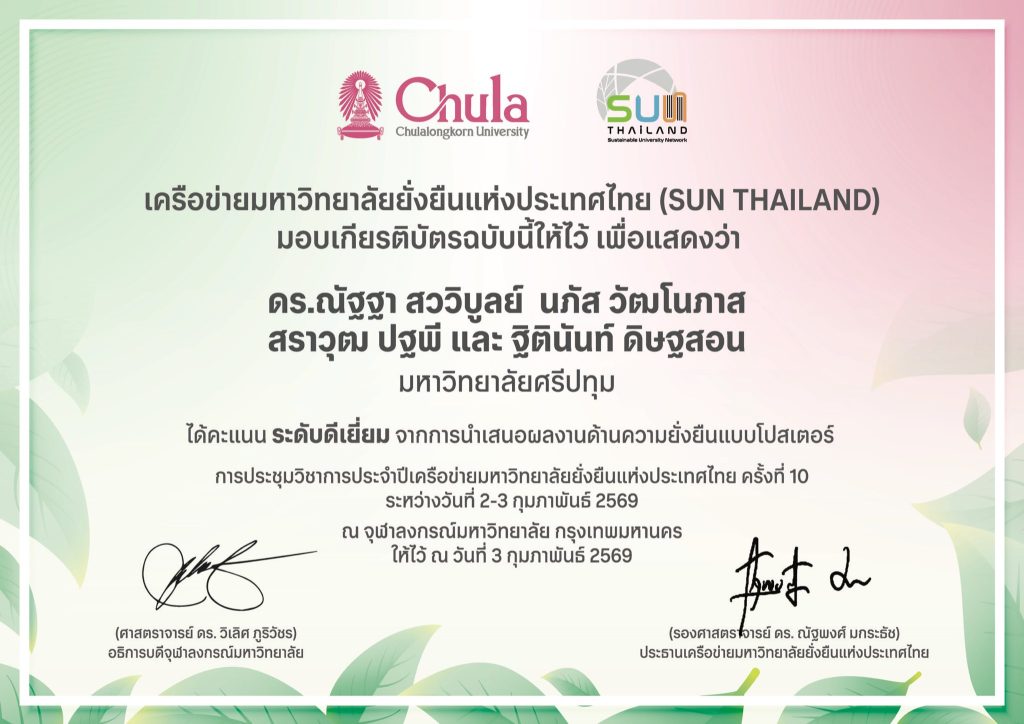 คณะการออกแบบและสถาปัตยกรรมศาสตร์ มหาวิทยาลัยศรีปทุม สร้างผลงานโดดเด่นบนเวทีวิชาการระดับประเทศ คว้ารางวัลระดับ “ดีเยี่ยม” จากการนำเสนอผลงานในการประชุมวิชาการเครือข่ายมหาวิทยาลัยยั่งยืนแห่งประเทศไทย ครั้งที่ 10 SUN Thailand ภายใต้การประชุม ASCN & SUN Thailand Conference 2026 ในกลุ่ม Innovation & Research for a Sustainable Future ประเภทโปสเตอร์ของคณาจารย์ บุคลากร และบุคคลทั่วไป ซึ่งจัดขึ้น ณ จุฬาลงกรณ์มหาวิทยาลัย ระหว่างวันที่ 2–3 กุมภาพันธ์ 2569 ที่ผ่านมา