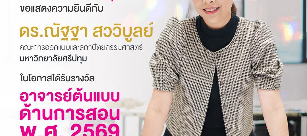 คณะการออกแบบและสถาปัตยกรรมศาสตร์ มหาวิทยาลัยศรีปทุม ขอแสดงความยินดีอย่างยิ่งกับ ดร.ณัฐฐา สววิบูลย์ คณาจารย์ประจำคณะ ในโอกาสได้รับรางวัล อาจารย์ต้นแบบด้านการสอน พ.ศ. 2569 ซึ่งจัดขึ้นโดยความร่วมมือระหว่างสำนักงานปลัดกระทรวงการอุดมศึกษา วิทยาศาสตร์ วิจัยและนวัตกรรม และสมาคมเครือข่ายการพัฒนาวิชาชีพอาจารย์และองค์กรระดับอุดมศึกษาแห่งประเทศไทย